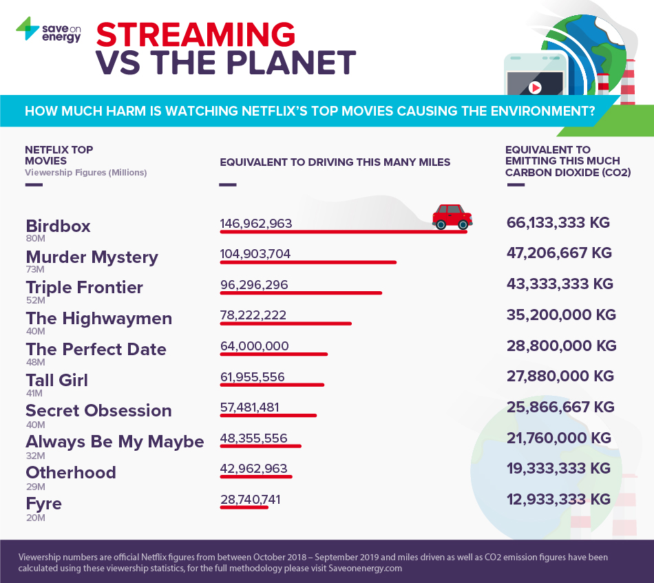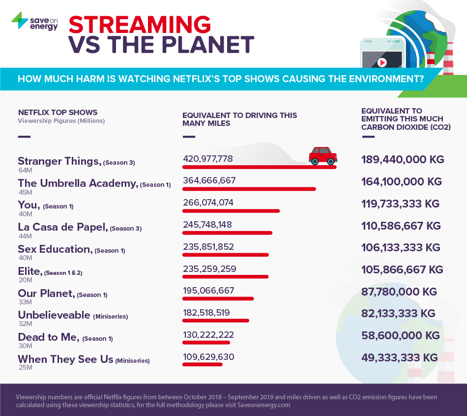 Interested in the carbon footprint from streaming, energy comparison site SaveonEnergy utilized official viewership figures to discover what watching Netflix’s top original movies and shows are equivalent to in terms of miles driven by a car, and the amount of carbon dioxide (CO2) emitted.