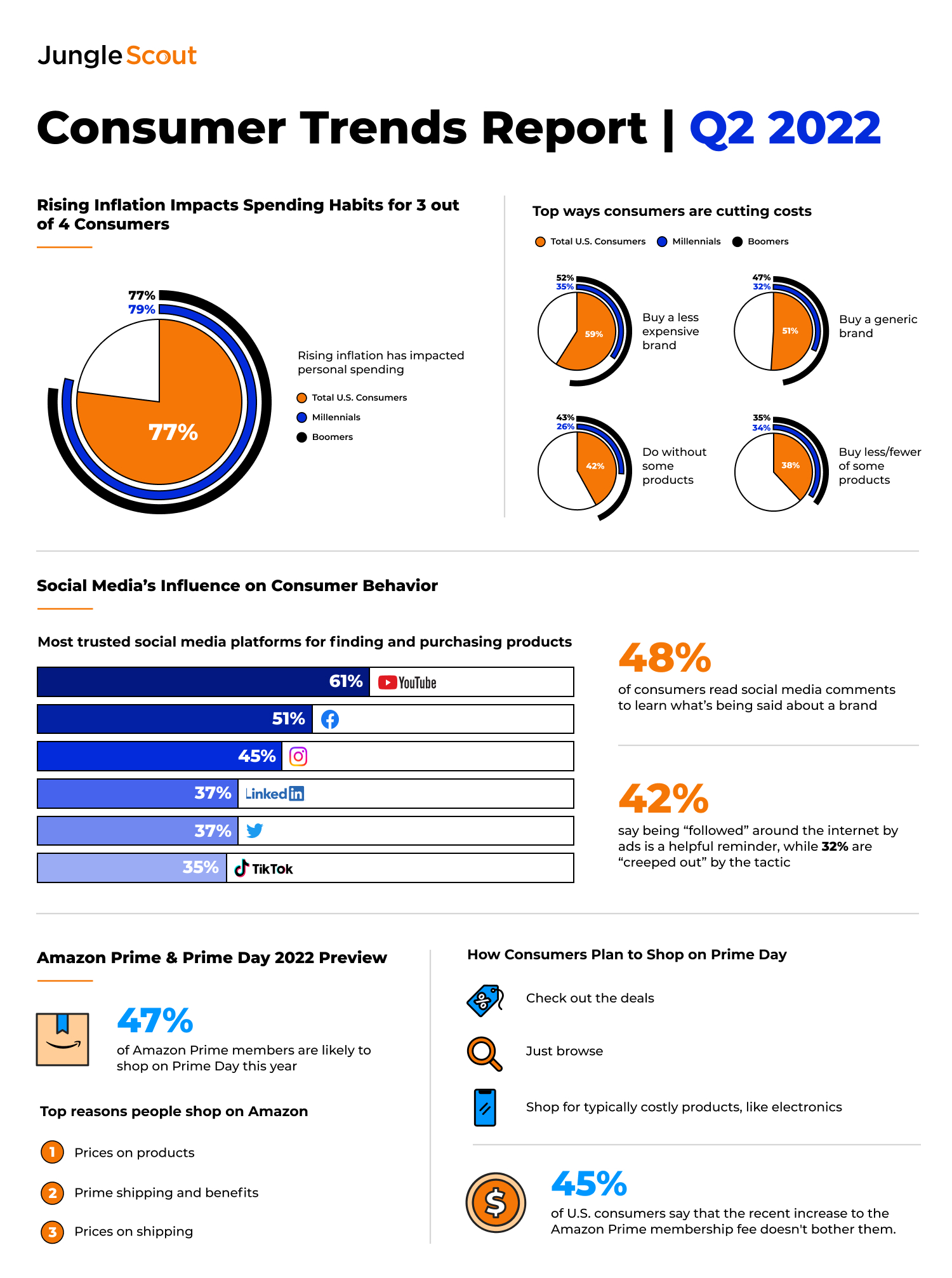 The findings from this survey have been released in Jungle Scout’s Q2 2022 Consumer Trends Report. This e-commerce report is a quarterly study of U.S. consumers that explores spending and e-commerce trends. The report finds that 59% of consumers are buying less expensive brands to cut costs. While inflation continues to impact consumer spending, social media, pricing, and brand loyalty are key factors in shopping behavior.